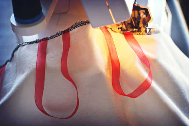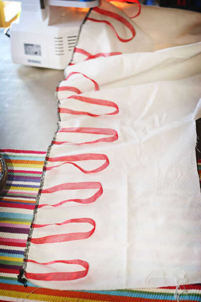 Tomé una tira larga de tela y utiliza mi máquina overlock para coser el borde superior, añadiendo bucles de cinta donde quería una correa para ser. (Puede usar una máquina de coser normal, por supuesto, acaba de encontrar la máquina overlock para ser más rápido y más limpio).
