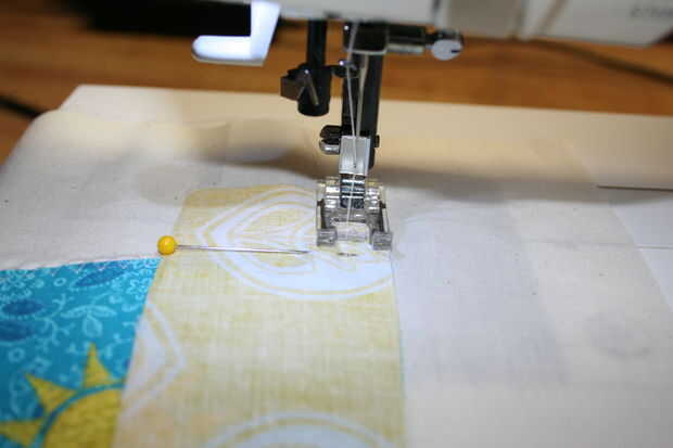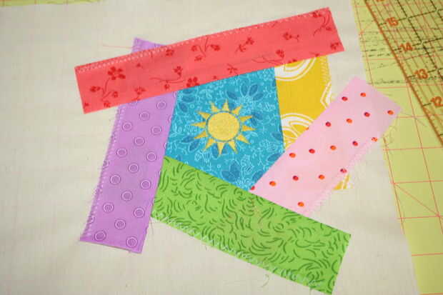 Continúe alrededor de la pieza del centro, añadiendo y superposición de las tiras, en especie de una especie de bloque de cabaña de madera de estilo. Sólo asegúrese de que mantener un margen de costura de 1/4 constante, si vas de que vas de que simplemente no funciona así, y tendrás arrugas y rareza.