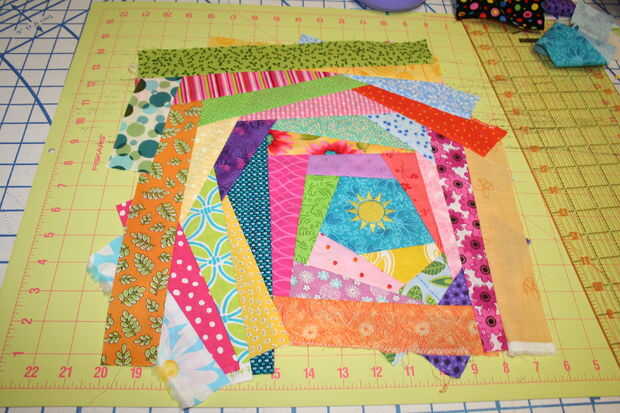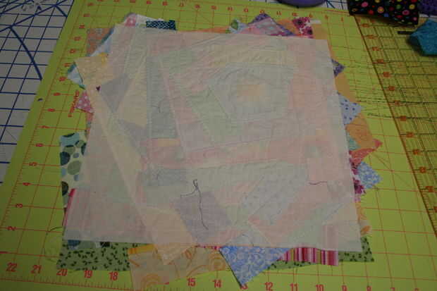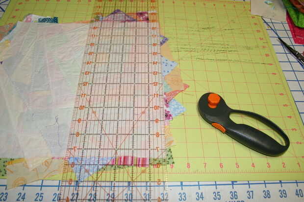 Voltee la pieza sobre mi tapete de corte, por lo que es el lado de muselina. Poner su regla por el lado de la muselina y basta con ejecutar el cortador rotatorio en el costado. Repetir esto en todos los lados de la Plaza.