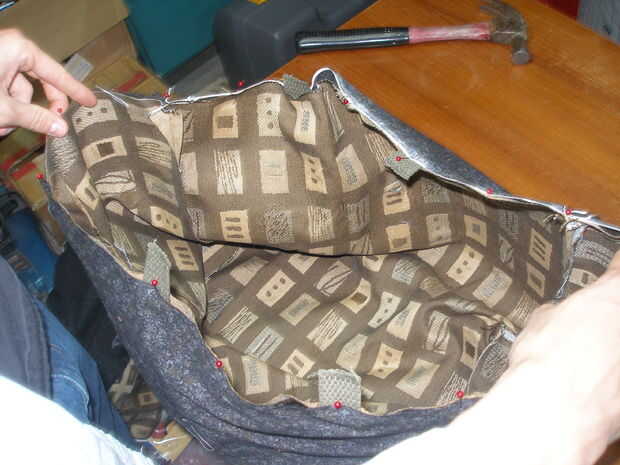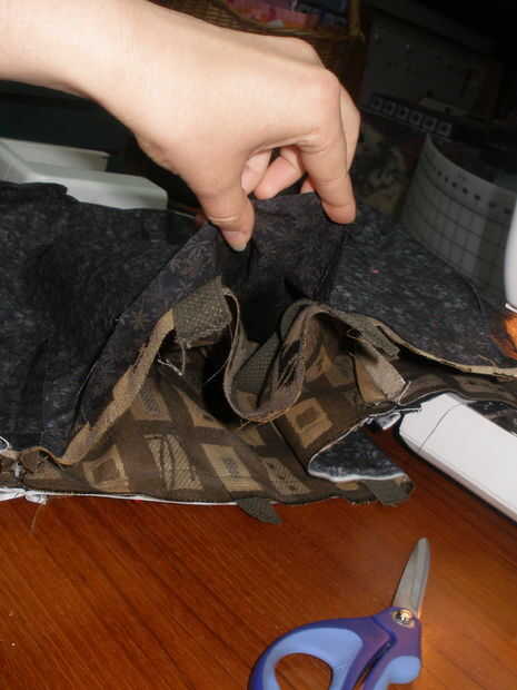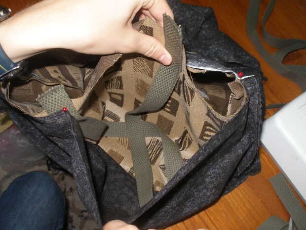 Usted debe ser capaz de ver donde ha marcado los puntos donde quiera a las correas para ir. Cortar la cinta o la cinta a la longitud que desee además de una o dos pulgadas a cada lado para sujetar la bolsa. El parque de lazo de la correa (la parte que te aferras a) debe ser entre la capa de la línea y la bolsa con aproximadamente una pulgada fuera de la costura superior y alineado con las marcas realizadas anteriormente. No podrás ver la mayoría de las correas y que es aceptable! Confía en mí en esto...