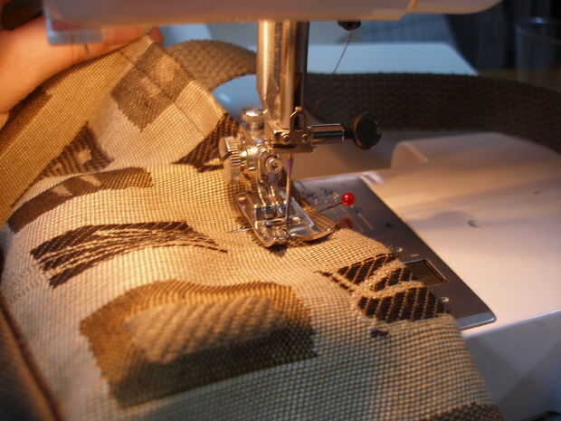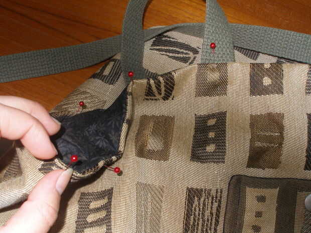 Encontrar el orificio de perno cerrado y pin el forro y la tela del bolso exterior juntos y puntada en la parte superior. Esto cierra el agujero de la costura, hacer el revestimiento permanecer dentro de la bolsa mejor y fijar las correas de más a tu bolsa.