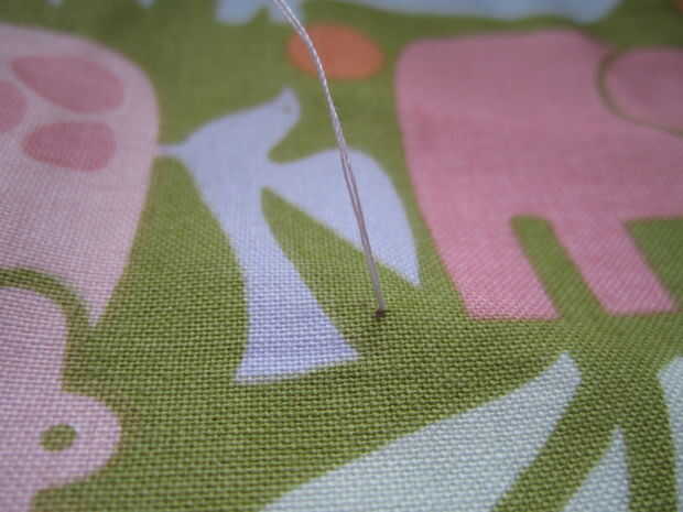 • subir la aguja y el hilo a través de la tela en el lugar que marcó