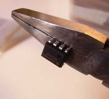 Si desea coser IC primero debe comprobar que sus piernas tienen una echada de 2.54 milímetros (0,1"). Como ejemplo usaremos un temporizador 555 que tiene 8 terminales. Continuar doblando con cuidado 90° con sus alicates todos los terminales de un lado al mismo tiempo.