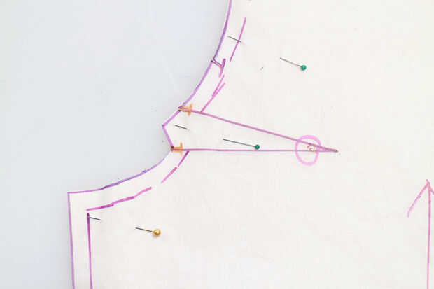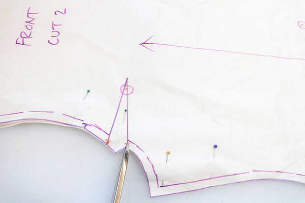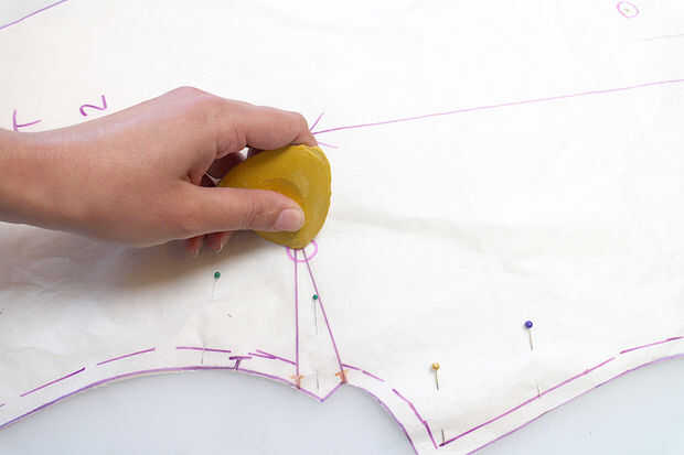 El objetivo es transferir las muescas de dart, sacador de agujero y, posiblemente, la línea de costura si escoges el patrón a la tela. Usted puede hacer esto con unas tijeras para cortar en una las muescas o puede prender o usar tiza para marcar dónde están las muescas.