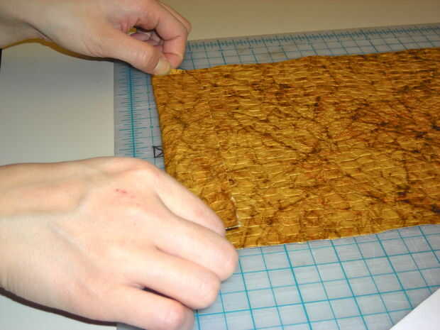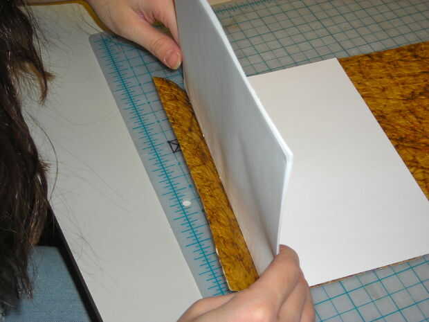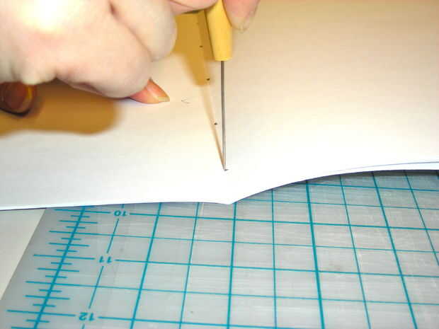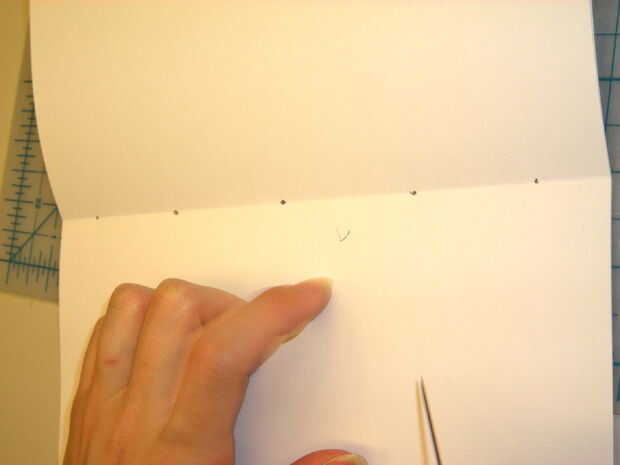 Doblar su papel de cubierta sobre la marca extra 1". Luego la línea hasta este doblez con el resto de su papel doblado, marcada. Una vez que los pliegues están todos alineados, utilizar el punzón (u otra herramienta afilada) para empujar a través de todas las capas de papel sobre las marcas realizadas. Este paso hará más fácil coser a través de más adelante.