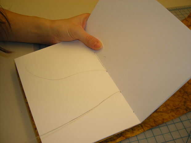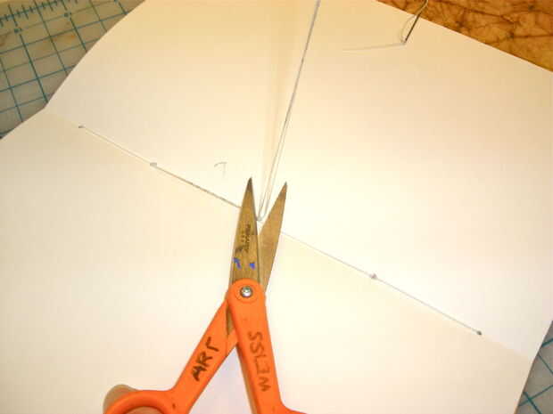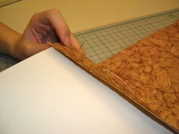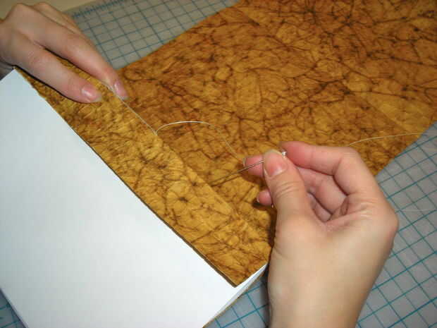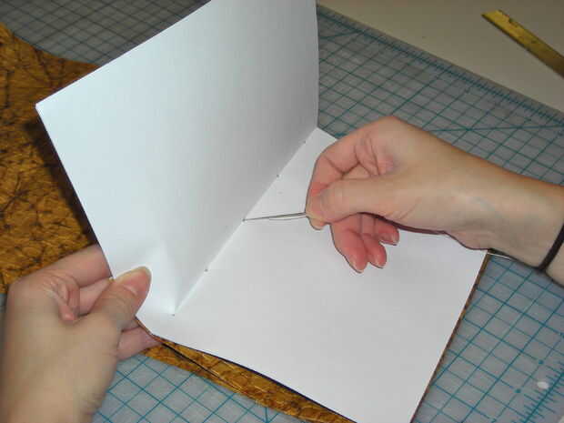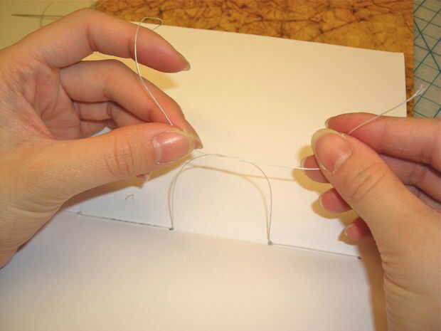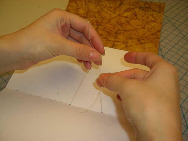 En este punto ha hecho todo lo de la costura y se debe dejar con el extras 2 pulgadas de cadena que mantuvo desde el agujero central (3) en el principio y la cadena extra de agujero (4), con los extremos en el mismo lado del folleto iniciado en. Debe ser cadena conectar todos los agujeros en la parte exterior de este folleto y todos los que en el interior excepto el espacio entre el agujero (3) y (4), que es donde se ata el nudo.