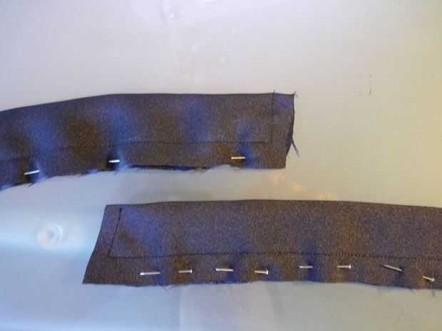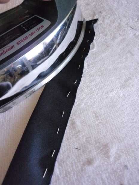 Ahora, utiliza el patrón para cortar las piezas del cinturón, o sólo cortar unos rectángulos de la Satén y nuevo tejido. Mina son aproximadamente 11" y 12" de largo, por 3.25" de altura. (Diversos tamaños para hebilla / correa.) Cosalas juntas en un extremo y el lado largo. Cortar, hacer muescas en la esquina y voltear de adentro hacia afuera. (Utilice un lápiz o algo para ayudar a empujar a través de). Ahora coser libremente (sin pespuntes) en la parte posterior de la espalda, en el borde y 5" más cercano al centro, para cada lado. (Esto se llama "hilvanes" y sólo puede fijar demasiado, pero vas a estar manejando mucho y no quieres pins. Ujo.