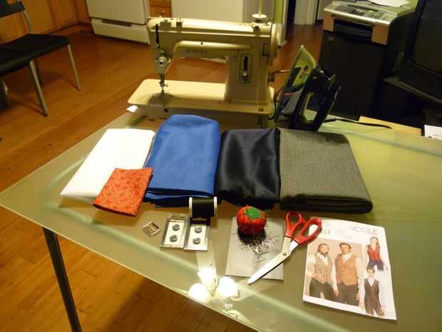 Materialesmaterial externo (consiguió 1 yarda, pero sólo la mitad es necesario que) guarnición material (lana) (usada 1 yarda) de Satén forro material (sólo necesaria media yarda) fusable interfaces (1 yarda) cuatro 5/8 botones 1" de la hebilla para el hilo posterior. (realmente no se puede coser sin él...) Voy mostrándole cómo coser el patrón chaleco unisex de moda (ooo, elegante), aquí: http://voguepatterns.mccall.com/v7644-products-1265.php?page_id=180