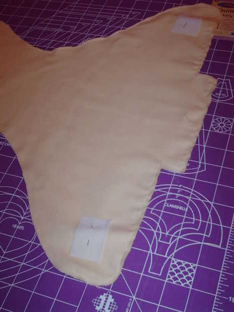 4. pines tabs para las alas. Para coserlas en, asegúrese de que dejar el lado recto dobladillo abierto porque tendrá que girar sobre el lado del gancho.