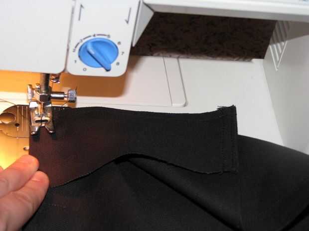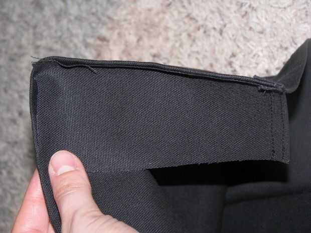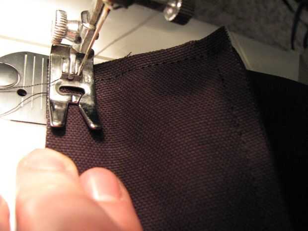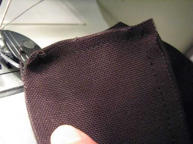 5) ahora Envuelva la parte posterior de la bolsa alrededor de la última parte de los refuerzos y coser un escudete, luego el otro, repitiendo los pasos 2-4. Esta vez, usted puede coser hasta la costura de la parte superior (dobladillo) de la escuadra. (Foto 4)