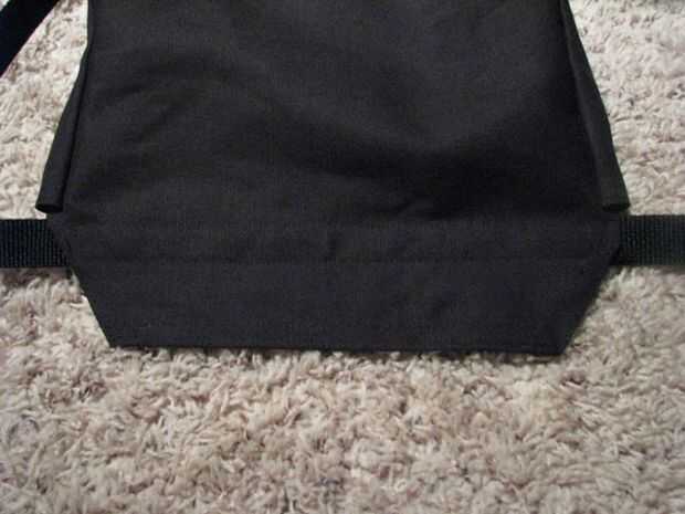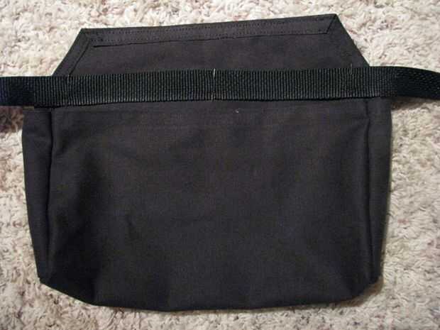 2) perno del centro de la correa al centro de la bolsa. La ubicación debe ser debajo de la aleta, en el punto donde la parte posterior de la bolsa se dobla más para convertirse en la aleta. (Foto 1)