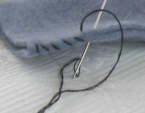 3. coser alrededor del borde curvo con sobre la puntada (ver segunda foto) y doble del hilo de rosca que los fósforos el fieltro. Estoy usando negro para que puedan ver mis puntos. Partir de la parte inferior al lado del borde plano. No coser el borde plano.
