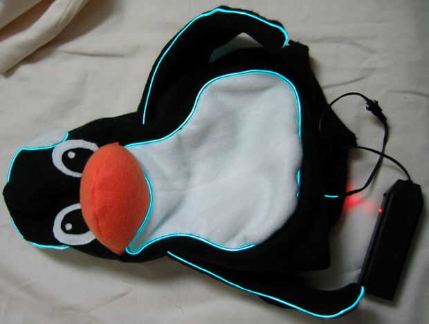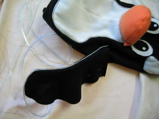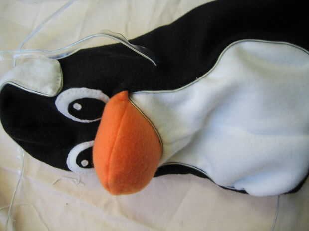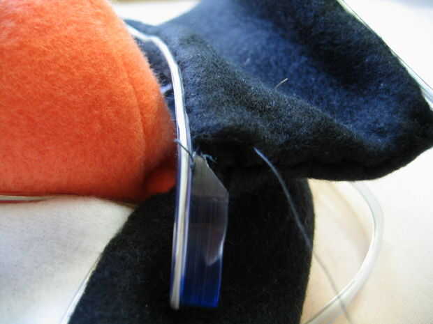 Después de completar el ala, hacer otro agujero donde se conecte el otro extremo del ala. Alimente EL alambre hacia el cuerpo a través de este agujero. Con el cable dentro, usted ahora puede coser la base del ala en el lado del pingüino. Repita este proceso con la otra ala en el otro lado de Tux. Cuando se acaban las dos alas, cortar el alambre sobrante y cose el extremo en el interior el pingüino. Es la porción de alambre EL de este proyecto!