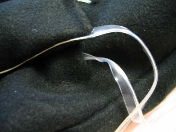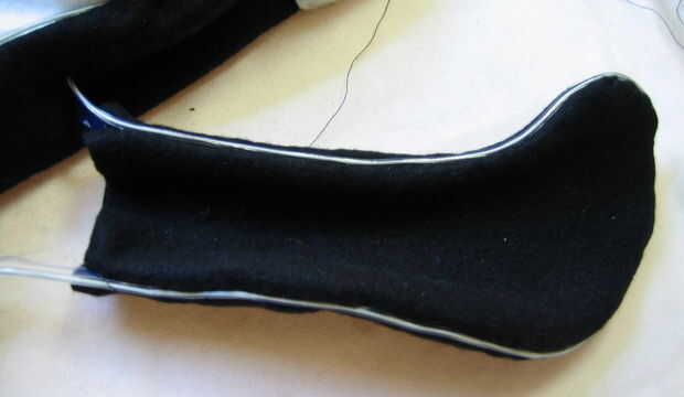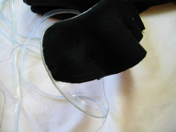 Decidí mantener el ala derecha hacia fuera y coser con puntada escondida modificada (o puntada escalera) para evitar tener que voltearlos lado derecho hacia fuera con EL cable conectado. Para ello, los márgenes de costura de tela debajo del tirón (doblado en la línea de costura) y el reverso de las alas junto con EL alambre en el medio. Luego coser una puntada escalera oculta en el ala entera, pero coser por la orilla EL alambre cada vez que cambias entre los trozos de tela.