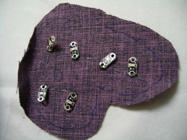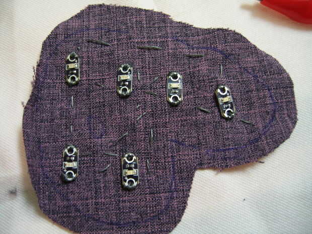 Cosa otra capa de logotipo en la parte superior las luces para ocultar el trazado de circuito. Me cosieron el derecho contra derecho las costuras y luego voltea lo lado derecho hacia fuera. Este método provocó algunos problemas con las esquinas en la forma, por lo que puede hacer una puntada oculta/escalera la manera entera alrededor con la tela lado derecho de salida. No se olvide de cortar un agujero en el sol y cosa así. Para hacer el LED visible, hacer una incisión pequeña (Yo utilicé a un destripador de la costura) directamente sobre el LED. Entonces utilicé hilo para coser a la tela firmemente alrededor de lo LED en los 4 lados. Me ha gustado subir el hilo a través de la tela cerca del agujero, luego llevarlo hacia abajo a través del agujero sí mismo (no va hacia atrás a través de la tela) para retirarse al tejido de la LED un poco.