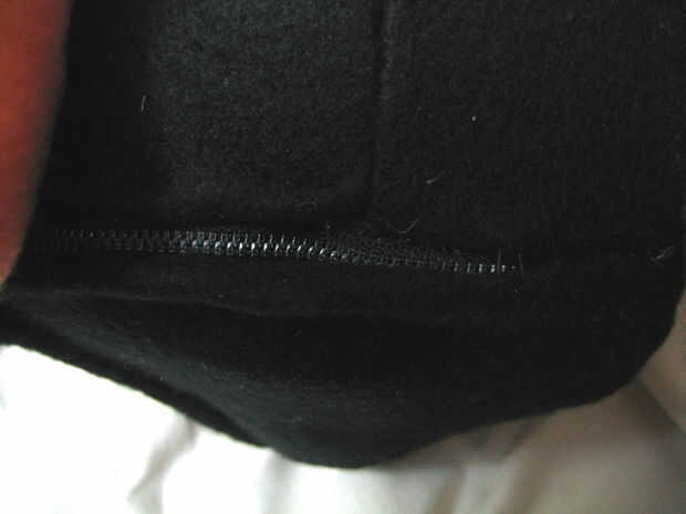 Mantenga el cierre con cremallera cerrada mientras se cose y cose de un lado a la vez. Recomiendo comenzar con la costura en el lado a Tux. Coloque la cremallera con el "arriba" hacia el lado bueno de la tela y coser la costura. Asegúrese que la costura esté lo suficientemente cerca de la cremallera que será capaz de abrir y cerrar, pero no es hasta ahora lejos que la cremallera es obvia y no sobresale. He dejado un sobrante de tela sobre el lado de Tux para poder plegar sobre sí mismo y parcialmente cubierta de la cremallera y hacer menos notable. Para hacer la tela excedente doble, doble sobre y añadir un punto o dos, sólo la tela de costura juntos. Hice la tela de la aleta grande, por lo que repetí el proceso con el otro lado de la cremallera.