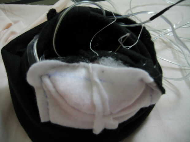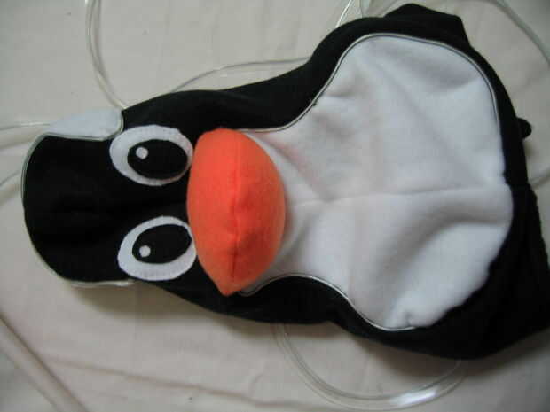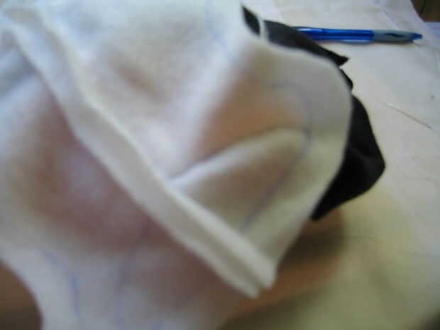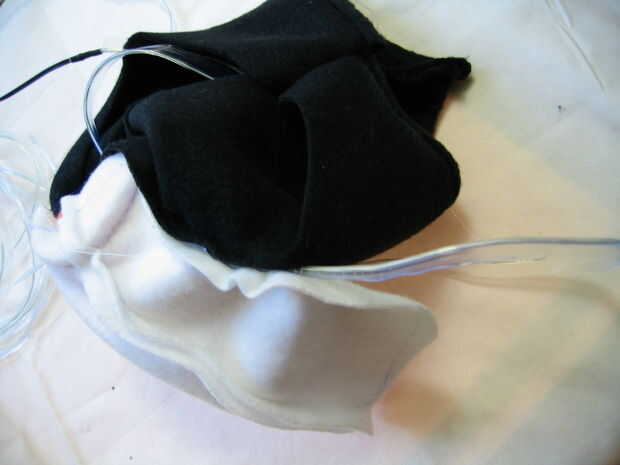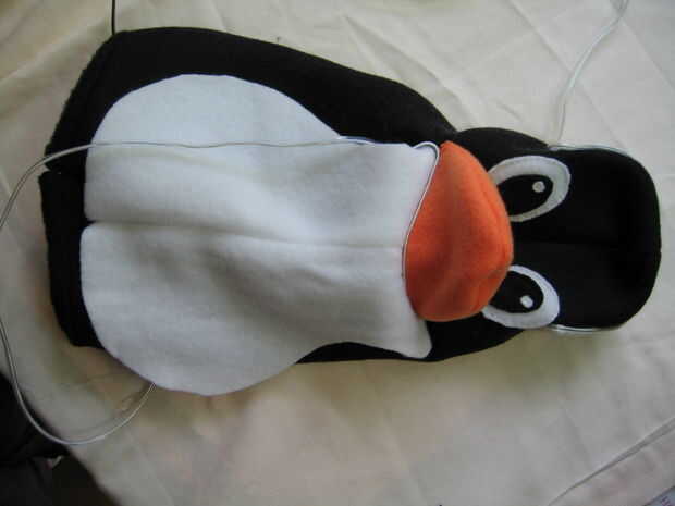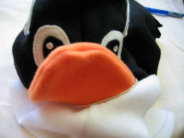 Luego, me rellena el pico y coser la parte superior del babero a la tela negra sobre el pico. No estoy seguro de debía, pero el patrón (me pareció) que es lo debían para hacer y mantendrá el relleno caiga fuera del pico y en el cuerpo de la cabeza.