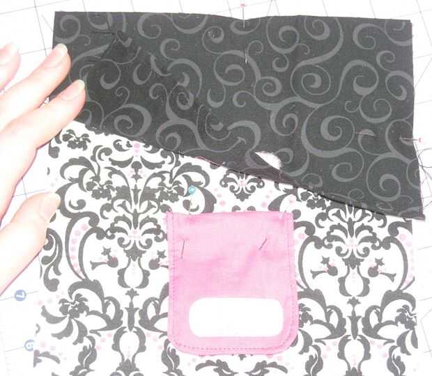 Ahora vas a tomar tu 9x7.5 pedazo de tela que es para el bolsillo de la DS y pin a un extremo para que coincidan los bordes crudos todos. Ahora no cose alrededor de él todavía.