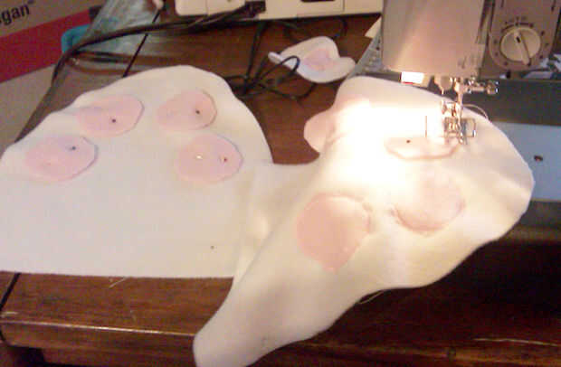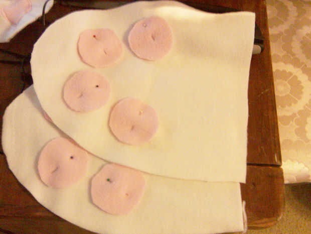 (mientras tenga el color de rosa o lo que sea pata de hilo de color en su máquina, coser la nariz a la boca de la misma manera) Coser las patas a extremos, como en la foto de la bufanda.