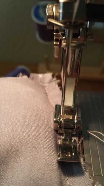 La porción de la falda del vestido tendrá una cremallera invisible. Este patrón particular tiene un forro de la falda, así que coser la cremallera es simple. Colocar la cremallera entre las dos capas y coser con el prensatelas de la máquina. Creo que es más fácil de coser una cremallera que está descomprimida, sólo asegúrese de que lado se enciende antes de coser la cremallera de la línea.