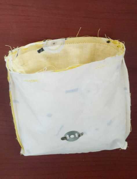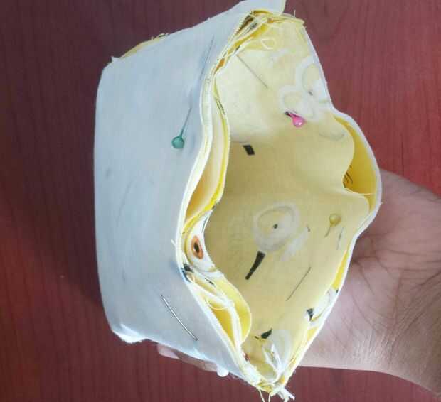 Organizar todas las piezas juntas. Primero tome la parte exterior del cuerpo con mal lados mirando hacia usted. Luego ponga el mango en los lados y les. El mango entero debería estar dentro. Mayo que no esté retorcido. Ahora coloque la pieza de forro derecho contra el lado derecho de la parte exterior. (Cuadro 1) Continuación, inserte la parte de aleta entre la parte exterior y parte interior con derecho de la aleta hacia la parte exterior de la tela. Para ello en el lado no-botón de la parte exterior. (Foto 2) Prender todas las capas juntas. Hacer una puntada todo dejando 3" brecha en el frente (lado del botón) convertir todo hacia fuera.