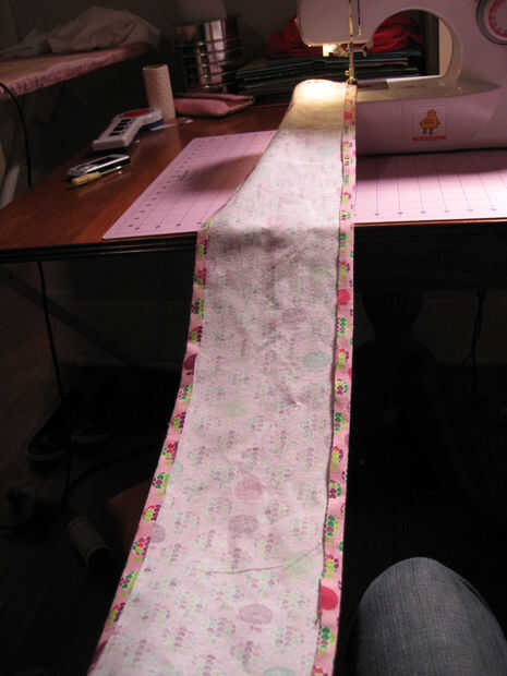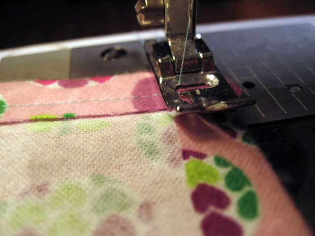 Luego, con el revés hacia arriba y la campana en su regazo, comenzar con el lado derecho de la bufanda y coser todo el perímetro exterior, manteniendo el borde de la tela para el borde del prensatelas, pespunte en ambos extremos.