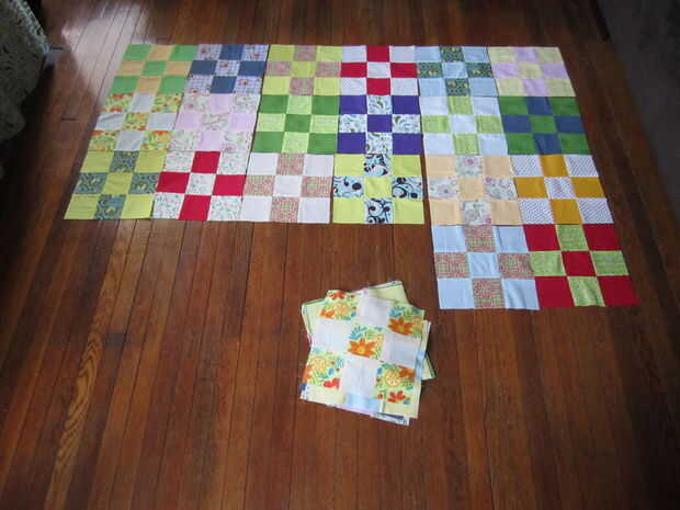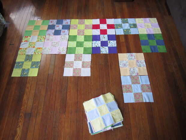 Encontrar una pieza vacía de piso y colocar los bloques. No puse demasiado pensamiento en esto para colchas de patchwork. Como mucho ya que no son demasiados colores similares tocando eres bueno para ir!