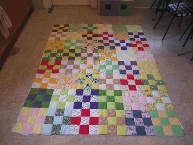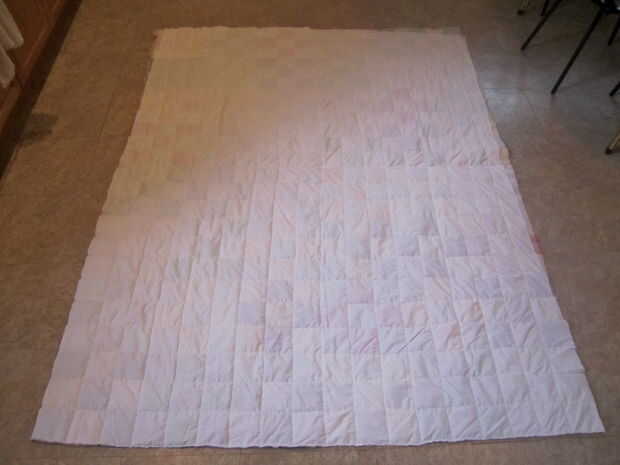 Su edredón acabado se verá esencialmente como una cuadrícula hinchada. Esto es más fácil ver en la parte posterior. Lo más probable es que tienes un montón de pequeñas arrugas en la tela y esto está bien. Mi opinión es que debe buscar una colcha patchwork como fue hecho en casa. Todas esas arrugas poco le dan carácter.