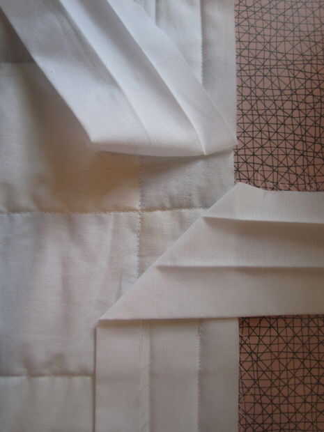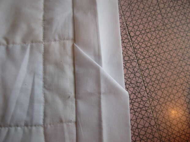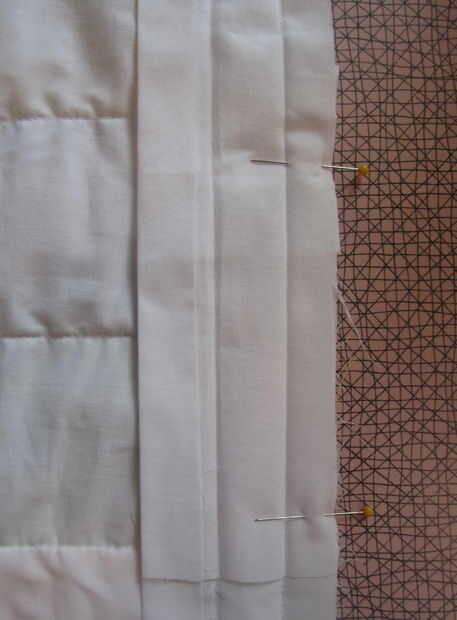 Doble el exceso de la parte inferior como se muestra en el cuadro 8. Pone el exceso superior, alineando los bordes brutos y pin. Ahora corte el exceso de la parte inferior. (Imagen 9)