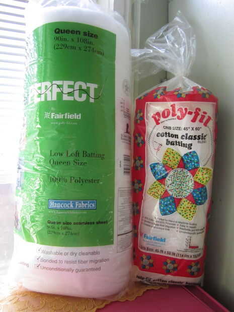Poliéster es más pesado y por lo tanto más caliente - pero tiene una tendencia a Manojo y también empujar su camino a través de la parte superior de la colcha con el tiempo. (es mejor usarlo en los edredones de color luz - en los más oscuros, verá pocas fibras blancas asomando a través de) Es más barato que el algodón en muchos casos.