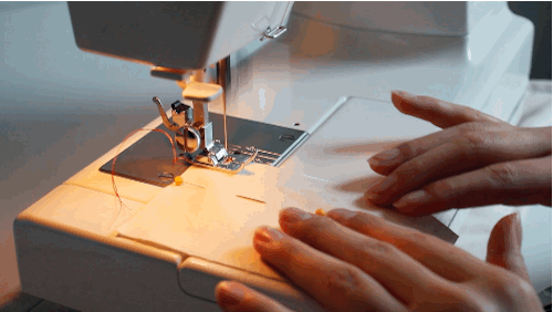 - Coloque a la tela bajo la aguja por lo que su margen es correcta y el borde de la tela es de 1/4 de pulgada más allá de la aguja y tirar de los hilos en la parte posterior de la máquina