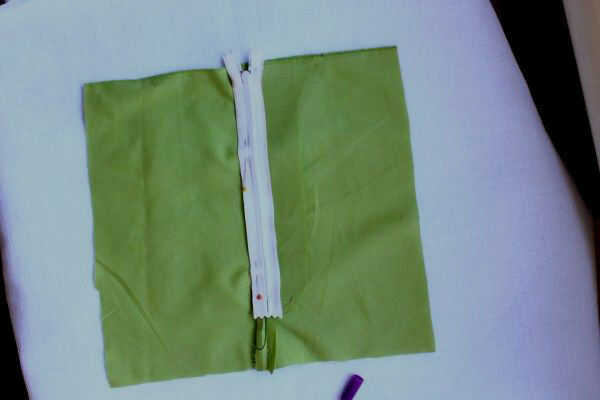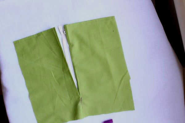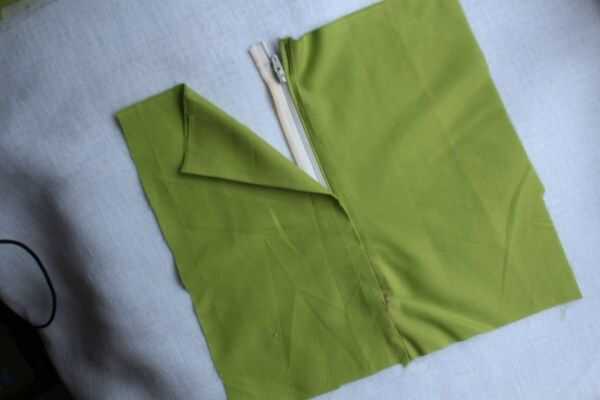 Ponga el zip en la punta doblada, alinee los bordes y el zip listo para ser cosido.