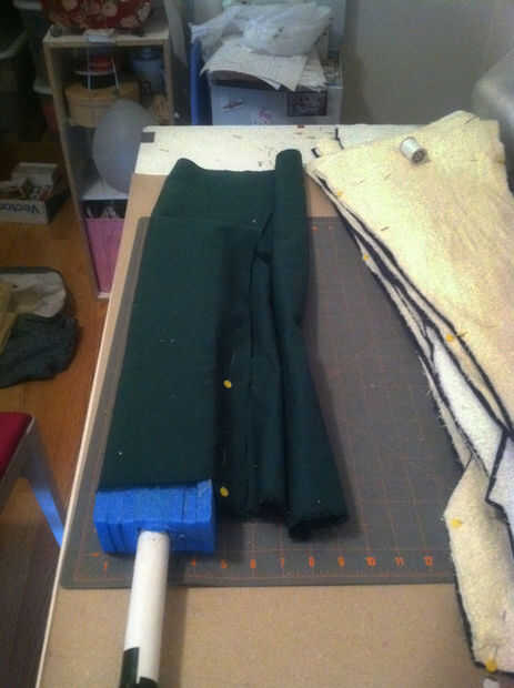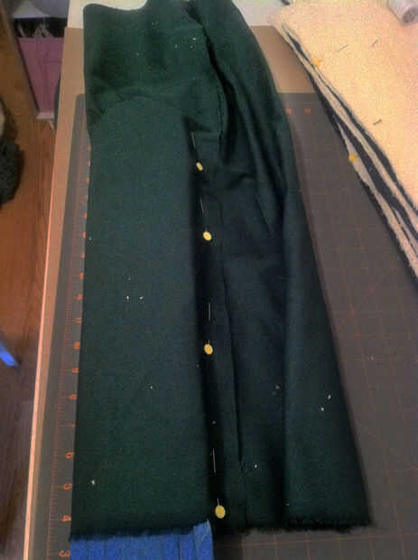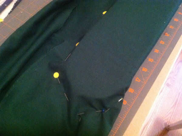 El perno por el lado de la hoja manteniendo a la tela firmemente hasta el borde. Poner tantos alfileres como se necesita en la curva a la fuerza para mantener su forma, pero a diferencia de mí intenta recordar mantenerlos todos la misma dirección.