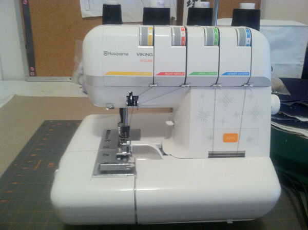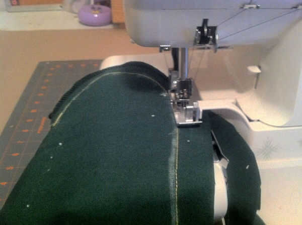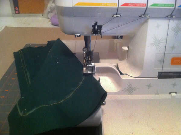 No pin de la tela, sólo asegúrese de que la tensión es correcta y recorren la cubierta. En este caso utilicé una puntada overlock doble y un poco demasiado tela extra a la izquierda en el lado, pero se coloca sobre el arma bien así que lo dejé. Ya que es un poco de un arma de novato sergering la cubierta es matar demasiado, pero para mi esposo de jock stick es esencial.