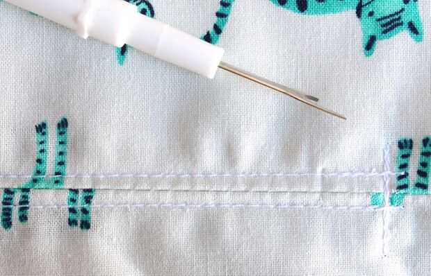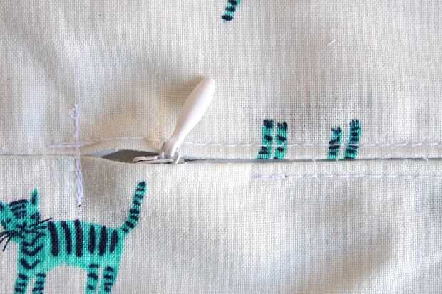 Comenzando en el extremo de la cremallera donde se cosen todos los tres bordes, insertar al destripador de la costura y retire con cuidado los puntos de sutura entre las dos filas verticales de puntadas en cada extremo de la cremallera.