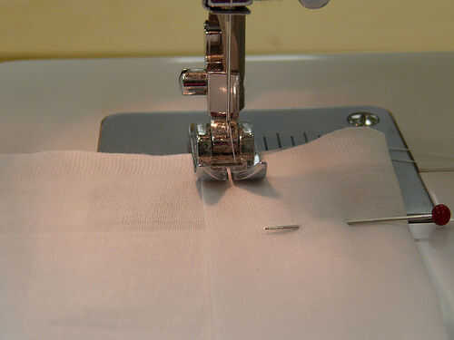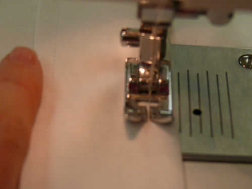 Comenzar con la parte exterior del doblez y coser con un margen de costura de 1/4 puntadas hacia atrás al principio y al final del lado.  Repita con el borde interno.