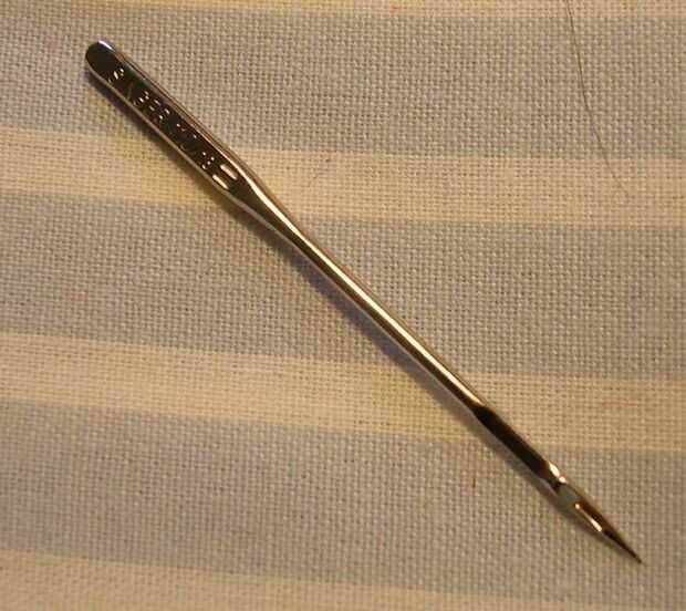 B2. Para este primer bit de la costura, usted puede usar una aguja para la tela de peso medio, tejida. (En cuanto a la elección de agujas, parecen tener eventualmente una variedad de agujas. Varias cosas pueden determinar el tipo de aguja utilizar, tales como la elección de la tela o el tipo de puntada. Cuando usted está haciendo costura regular, peso de la tela determina el tamaño de las agujas, y el tipo de tejido determina la forma del punto de la aguja.).