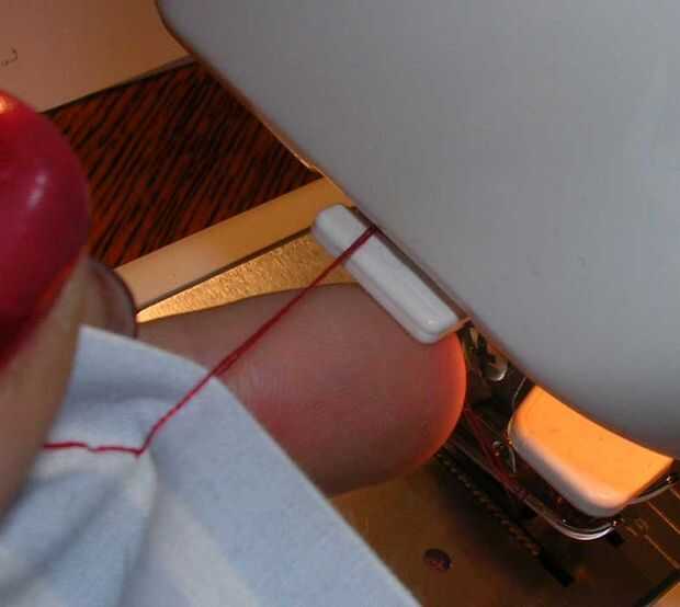 d. sacar su parte superior e hilos de la bobina aproximadamente 6 pulgadas detrás de los alimentadores. Cuando comience su primera puntada, asegúrese de que tiene en sus manos en su parte superior y los hilos de la bobina, como puede "aspirar" en la máquina en las primera algunas puntadas.
