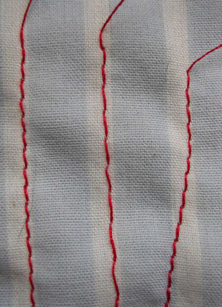 b. rectas en la raya: ¿pudo coser justo abajo de la raya o es la costura un poco offsides? Esto tomará simplemente práctica. Seguir practicando hasta que sus dedos guían ágilmente el tejido recto como una flecha.