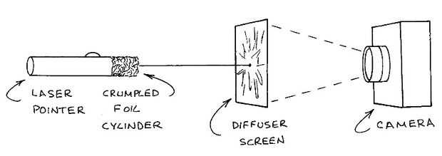 La figura 1 muestra una de muchas maneras simples para crear patrones de arte láser. El ingrediente clave para esta receta es un cuadrado de papel de aluminio envuelto alrededor de la empresa de un puntero láser o módulo. El papel está arrugado para proporcionar un campo de las superficies reflectantes muy complejas. Luego se enrolla alrededor del final del puntero láser con el lado brillante hacia adentro. El extremo abierto de la hoja es parcialmente presionado interceptar y reflejar el rayo láser. El láser es apuntado hacia una pantalla de difusor (véase abajo), y el patrón formado en la pantalla es capturado por una cámara digital en el lado opuesto de la pantalla.