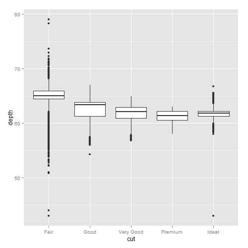 qplot(cut, depth, data=diamonds, geom=c("jitter", "boxplot") Nota: El orden en el que especificar el geoms es importante porque la primera de ellas se colocará el segundo. Se puede experimentar para determinar cual arreglo es mejor para sus datos, aunque no ven muy bien de cualquier manera en este caso. Un mejor ejemplo de cómo incluyendo ambos estos geoms puede producir una buena visualización de los datos se puede encontrar cerca de la parte inferior de esta página (así como más información sobre variación).