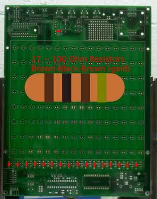 1. selecciona las resistencias de 100 ohm (marrón-negro-marrón). En el esquema y PCB son piezas R1 - R16, R30. La primera foto muestra sus posiciones con rectángulos rojos y también enseña a identificar las resistencias utilizando el código de color. Coloque las resistencias y les de la soldadura.