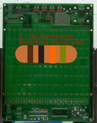 2. selecciona las resistencias de 10K (marrón-negro-naranja). Estas se utilizarán para las piezas R17, R18, R19, R22, R23, R31. (R36, R37, R38 no se utilizan)