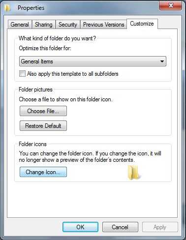 Click derecho sobre la carpeta luego seleccione Propiedades y haga clic en la ficha personalizar.