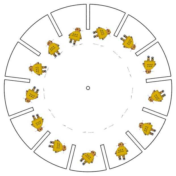 Mira el ejemplo adjunto. El punto de partida es el gif animado del robot, y el resultado final es el disco completo. De hecho, el proceso es más o menos una conversión de formato de imagen. Simplemente extraer los frames GIF y ponerlos en un círculo.