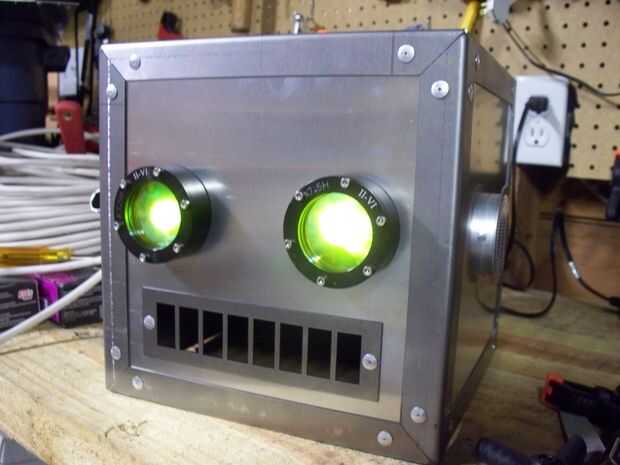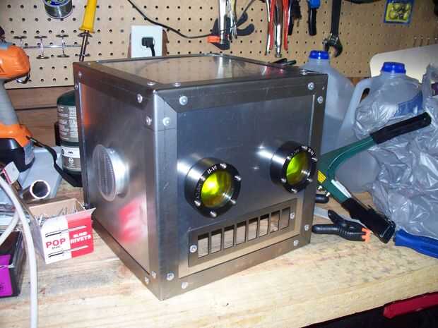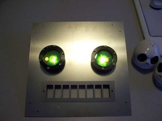 Los ojos entonces fueron asegurados en la pieza de la cara con cinta adhesiva como se muestra a continuación. Luego clavan la Asamblea con los ángulos formados y piezas de metal de hoja que hice en mi trabajo. Esto resultó para ser más difícil de lo que pensaba que mi diseño no deja mucho espacio para el error en cualquier nivel. Debo haber destinado más sala de fudge, donde la hoja de aluminio se unen en las esquinas. Todo funcionó al final sin embargo.