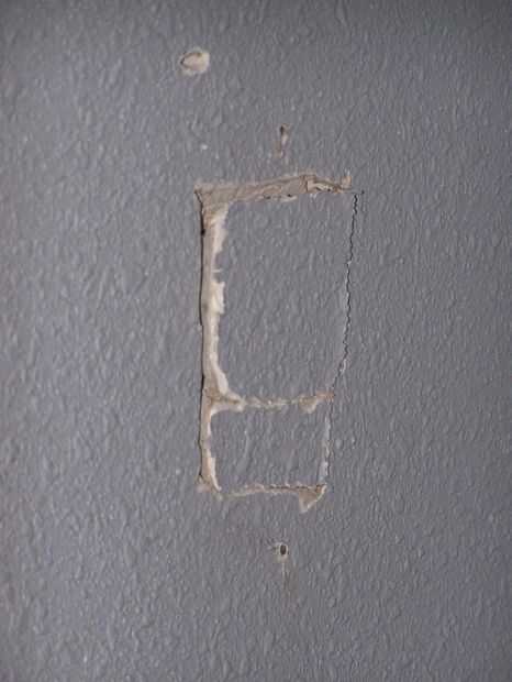Ahora realizará su sierra de panel de yeso y corte un orificio de inspección. Es mejor hacer este agujero lo suficientemente grande como para caber la mano en por lo que se puede sentir de las cosas.  {Importante: haga el orificio en un ángulo 45 grados para que el yeso se cae hacia adelante y fuera de la pared... no en la pared. Esto también hará más fácil debes encontrar algo y no poder continuar con el proyecto y la necesidad reparar el agujero que sólo se cortan. }
