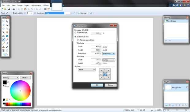 Para Photoshop y Paint.NET tenes imagen, lona Size.Then golpear OK.