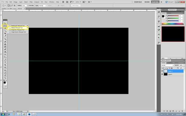 Vamos a empezar por crear una cuadrícula. En la frontera de la regla en la parte superior, haga clic en y arrastre hasta la mitad. (Usted puede hacer la frontera regla aparecen pulsando control + r). Lo mismo en la frontera de la regla de lado. Asegúrese de que la intercepción de líneas en el centro. Haga clic en la herramienta marco elíptico. Si vas a donde las líneas se interceptan que el cursor cambiará a una cruz roja. Ahora mientras se mantiene ALT + SHIFT arrastre el cursor para hacer el tamaño deseado de circle(firework) como.