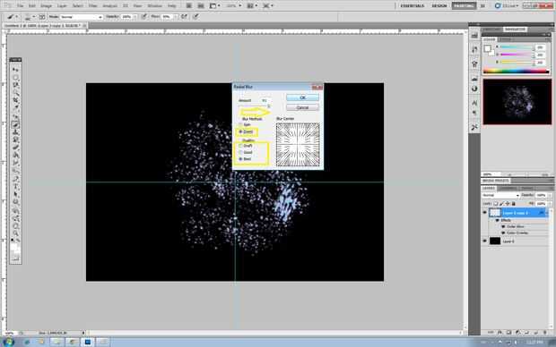 Click onto the paint brush tool. Una vez que tenga que subir para cambiar el estilo de pincel. Seleccionar pincel #100 y aumentar el tamaño de la misma. Cambiar el color de pincel blanco y haga clic en alrededor del círculo para pintar alrededor de él. Presione CTRL + J, un par de veces para crear capas adicionales para hacer más brillante. Seleccione varias capas y haga clic derecho y seleccione combinar capas. Ahora haga doble clic en el capa para abrir la ventana estilo de capa. Haga clic en resplandor externo y cambiar el color. Haga clic en superposición de color y cambiar ese color también. Aplicar efectos. Ahora haga clic en filtro en la barra de herramientas superior y elija Desenfocar y desenfoque Radial entonces. Elevar el monto a una cantidad alta y cambiar el método de desenfoque para zoom. Escoge su calidad basada en la velocidad de tu ordenador. Presione CTRL + J, un par de veces para crear capas adicionales para hacer más brillante. Seleccione varias capas y haga clic derecho y seleccione combinar capas. Aquí tienes sus fuegos artificiales.
